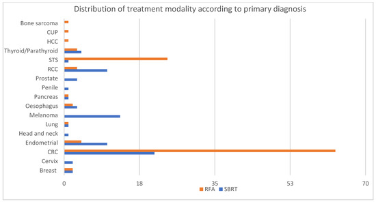 Distribution of primary diagnoses treated by SBRT and RFA. RCC—renal cell carcinoma; STS—soft-tissue sarcoma; HCC—hepatocellular carcinoma; CUP—carcinoma of unknown primary; CRC—colorectal cancer.