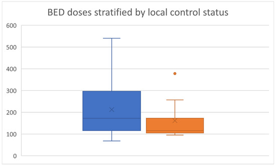 Box-and-whisker plot of BED doses in SBRT cohort stratified by local control status (left, in blue: local control; right, in orange: local failure).