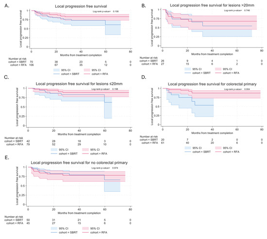 Subgroup analysis of lesions stratified by size (≤20 mm vs. >20 mm) showed similar LPFS rates for both techniques in both smaller (p = 0.198) and larger lesions (p = 0.746) (Figure 3B,C). In view of the difference in local control between colorectal patients treated with RFA and SBRT, subgroup analysis was also performed. RFA was associated with better LPFS in colorectal patients (p = 0.004), and this effect was not maintained in non-colorectal patients (p = 0.974) (Figure 3D,E).