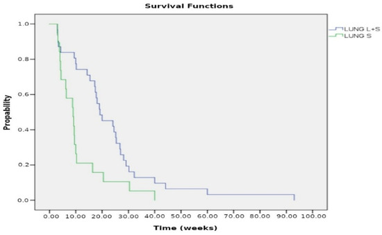 Kaplan–Meier curves for patients with lung cancer comparing combined local and systemic chemotherapy (L + S) versus systemic chemotherapy alone (S). The median survival was 19.2 weeks for the L + S treatment compared to 9 weeks for the S treatment; p < 0.005.