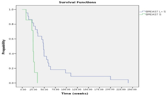 Kaplan–Meier curves for patients with breast cancer who received combined chemotherapy: Local plus systemic (L + S) vs. systemic chemotherapy (S) alone. The median survival was 48 weeks for the L + S treatment compared to 24.7 weeks for the S treatment; p = 0.001.