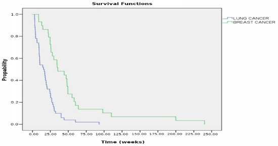 Kaplan–Meier curves of observation in patients with breast cancer vs. lung cancer. The median survival was 15.4 weeks for lung cancer vs. 35.4 weeks for breast cancer; p < 0.00005.