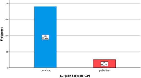 In analyzing the treatment intent proposed by both the surgeons and the MTB, a notable distribution between curative and palliative recommendations was observed. Initially, surgeons proposed curative treatment plans in the majority of cases, with 88.4% (191/216) designated as curative and 11.6% (25/216) as palliative. When reviewed by the MTB, these proportions shifted slightly, with 87.0% (188/216) of cases retaining a curative approach and 13.0% (28/216) adjusted to palliative intent. The distribution of curative versus palliative decisions made by surgeons and the MTB is shown in Figure 2.