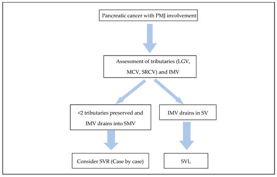 Diagram illustrating SV management during resection of pancreatic cancer involving the PMJ.