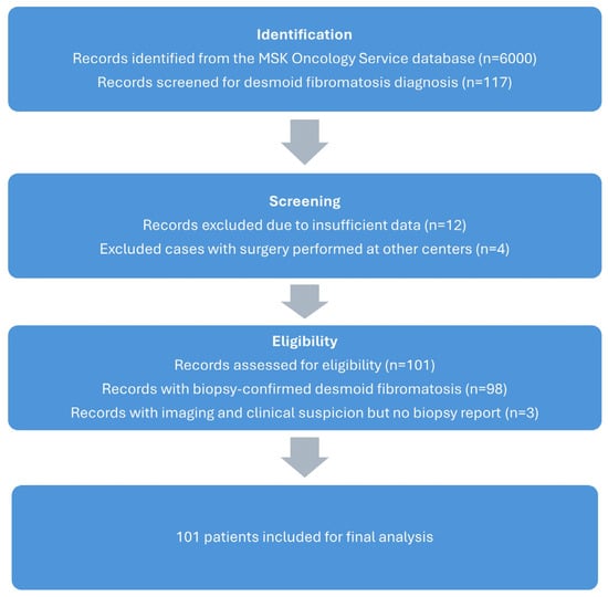 In this retrospective observational study, 101 patients with desmoid fibromatosis from 2010 to 2024 were included. The patients were identified from a database of over 6000 cancer patients managed at the MSK Oncology Service at GRI during the study period. Patients with biopsy-confirmed fibromatosis but insufficient data in the database were excluded.