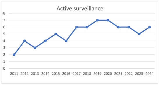 Increasing trend of active surveillance noted in study group (x axis–time, y axis–number of patients treated by active surveillance).