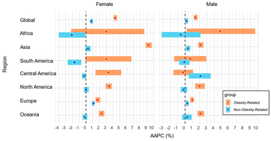 The global incidence of early-onset obesity-related cancers has increased both in females (ASR, 42.4; global AAPC, 4.3%; 95% CI, 4.1–4.6%) and males (ASR, 27.9; AAPC, 1.4%; 95% CI, 1.2–1.7%) (Table 1). Statistically significant positive AAPCs for obesity-related cancers were observed in Asia, Central America, North America, Europe, and Oceania among females, and in Africa, Asia, North America, Europe, and Oceania among males (Figure 1). Early-onset obesity-related cancers exhibited statistically significantly higher AAPCs compared to non-obesity-related cancers both in females [Global AAPC, 4.3% (95% CI, 4.1–4.6%) for obesity-related cancers vs. 0.8% for non-obesity-related cancers] and males [Global AAPC, 1.4% (95% CI, 1.2–1.7%) for obesity-related cancers vs. 0.2% (95% CI, 0.1–0.4%) for non-obesity-related cancers]. In Asia, while obesity-related cancers had increasing trends in both females and males, the magnitude was much higher in females [regional AAPC in females, 9.2% (95% CI, 8.8–9.7%) vs. AAPC in males, 2.1% (95% CI, 1.8–2.5%)]. Compared to non-obesity-related cancers, we observed statistically significantly higher AAPCs in early-onset obesity-related cancers in Asia, South America, Central America, North America, Europe, and Oceania among females, and in Asia, North America, Europe, and Oceania among males. When we analyzed by income levels, we observed statistically significantly higher AAPCs in early-onset obesity-related cancers in high-income countries compared to low-/middle-income countries among both females and males (Table 1).