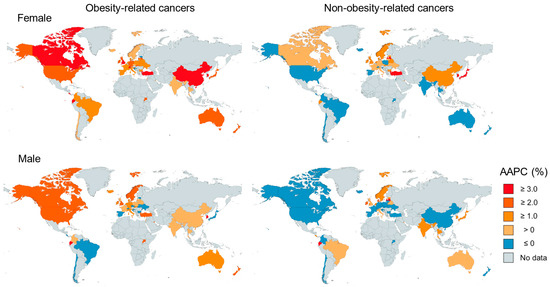 We calculated average ASRs and AAPCs for obesity-related (11 and 9 cancer types in females and males, respectively) and non-obesity-related cancers (12 cancer types in both females and males), as well as individual cancers. We defined global AAPCs as the population-weighted averages of AAPCs in all available countries combined. We also calculated ASRs and AAPCs by regions, income levels, and countries. Differences in the AAPC between obesity-related and non-obesity-related cancers were assessed by comparing 95% CIs, where non-overlapping 95% CIs were considered as statistically significantly different.