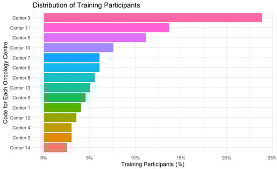 Distribution of SNP training participants at 14 centres. Legend: x axis, proportion of participants per centre including participants from both training sessions; y axis, code for each oncology centre.