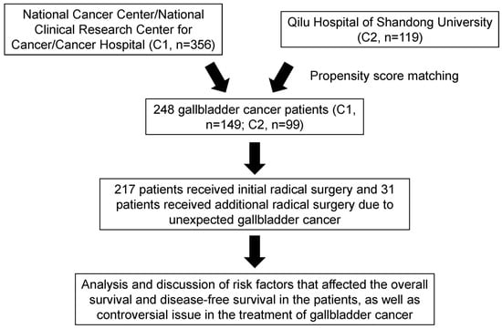 A retrospective analysis was conducted on data from patients who underwent resection for primary GBC between January 2010 and January 2022 at two Chinese medical centers: the National Cancer Center/National Clinical Research Center for Cancer/Cancer Hospital of Chinese Academy of Medical Sciences and Peking Union Medical College and the Qilu Hospital of Shandong University. The flowchart of the study is shown in Figure 1. Detailed information on the patients’ demographic characteristics, perioperative data, adjuvant chemotherapy, and oncological outcomes was obtained from electronic medical records and is presented in Table 1. This study was reviewed and approved by the Institutional Review Boards of both medical centers and was conducted in accordance with the Declaration of Helsinki [17].