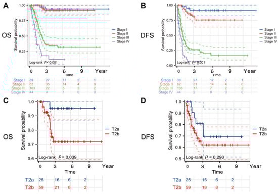 Kaplan–Meier curves. (A) OS curves according to TNM stage, (B) DFS curves according to TNM stage, (C) OS curves according to T stage, and (D) DFS curves according to T stage. Abbreviations: OS, overall survival; DFS, disease-free survival. All reported p values are two-tailed, with a significance level set at 0.05.
