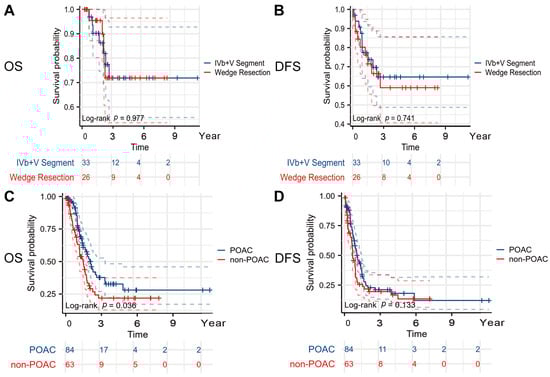 Kaplan–Meier curve in subgroup analyses. (A) OS curve according to extent of liver resection (IVb + V segment vs. wedge resection), (B) DFS curve according to extent of liver resection (IVb + V segment vs. wedge resection), (C) OS curve according to POCA in patients with stages III–IV, and (D) DFS curve according to POCA in patients with stages III–IV. Abbreviations: OS, overall survival; DFS, disease-free survival; POAC, postoperative adjuvant chemotherapy. All reported p values are two-tailed, with a significance level set at 0.05.
