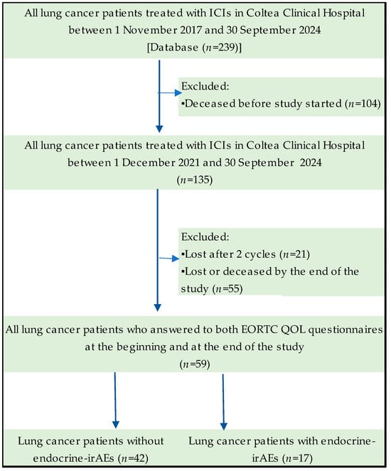 Our study investigated a population of 59 lung cancer patients treated with immunotherapy in a tertiary-level hospital in Romania, Coltea Clinical Hospital. Of the entire cohort of patients treated in this clinic from 1 November 2017 to 30 September 2024, 135 were alive on 1st December 2021, when the study started. By 30 September 2024, at the end of this study, only 59 lung cancer patients were alive to complete the EORTC quality of life questionnaires. The study flowchart of lung cancer patients over time is exemplified in Figure 1.