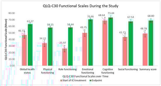 QLQ-C30 functional scales and summary score at the beginning of ICI treatment versus at the study endpoint.