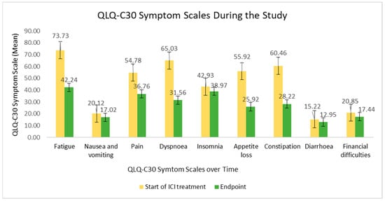 QLQ-C30 symptom scale at the beginning of ICI treatment versus at the study endpoint.