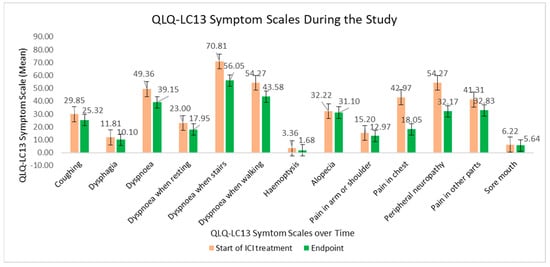 QLQ-LC13 symptom scales at the beginning of ICI treatment versus at the study endpoint.