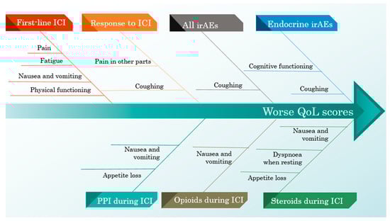 A cause–effect diagram illustrating the negative influence of ICI predictors on the QoL scores.