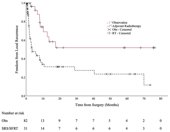 Local control of the post-operative SRS/SFRT and observation cohorts.