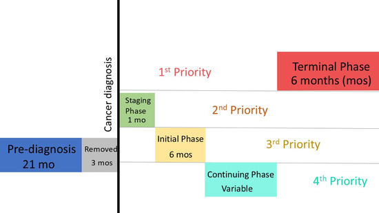 - Kaye, D.R.; Min, H.S.; Herrel, L.A.; Dupree, J.M.; Ellimoottil, C.; Miller, D.C. Costs of Cancer Care Across the Disease Continuum. Oncologist 2018, 23, 798–805. [Google Scholar] [CrossRef]