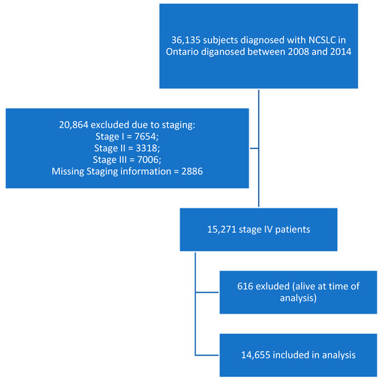 We conducted a retrospective, population-based cohort study on resource utilization and cost of care for patients diagnosed between 1 April 2008 to 30 March 2014 with follow-up through to 30 March 2017, who had passed away with stage IV NSCLC, and who had been treated within any one of fourteen healthcare regions within Ontario, Canada, for whom health utilization information was available. This study specifically focused on estimating cancer-attributable costs (CACs), defined as the net additional healthcare costs incurred by a cancer diagnosis, by subtracting each patient’s baseline pre-diagnosis costs from their post-diagnosis costs.