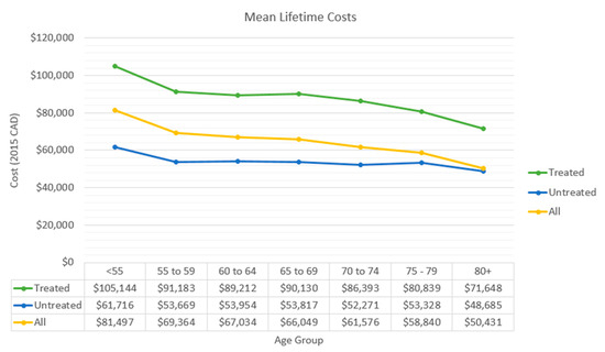 After diagnosis of cancer, younger patients incurred a higher average lifetime total cost than older patients (Figure 3). This was especially the case amongst patients who received systemic therapy, with the youngest group incurring the highest cost (CAD 105,144 in ≤55 years old) and the oldest group incurring the lowest cost (CAD 71,648 in >80 years old) (Figure 3).