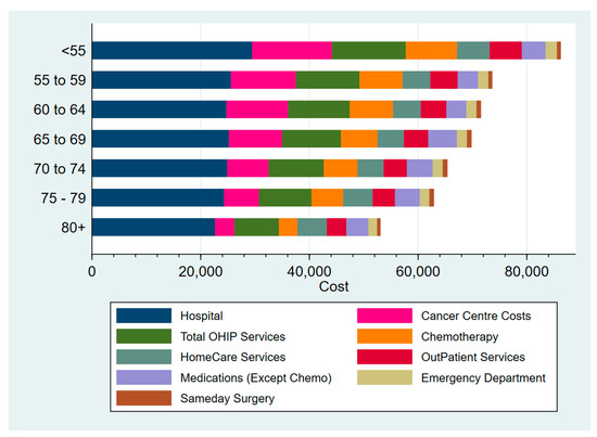 The following supporting information can be downloaded at: https://www.mdpi.com/article/10.3390/curroncol32060346/s1, Table S1: Percentage contribution and mean costs of various categories of care amongst patients who received treatment (n = 4219); Table S2: Average monthly CAC by phase of care across age groups (2015 CAD$); Table S3: Multivariate linear regression analysis adjusting for clinical factors associated with cost differential across various phases of care.