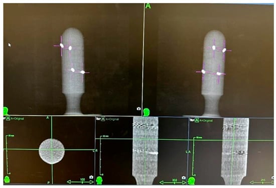 - Step 1. “CT test”: This involved the acquisition of CT simulation scans with the applicator positioned horizontally (as for endovaginal insertion) on a radiolucent solid water base and transmission of the images to the Treatment Planning System (TPS). During Step 1, the following were verified: correct insertion and positioning of the fiducials in the slots, verification of the rigid body and fiducial interval parameters. Figure 5 shows the CT images acquired and displayed on the TPS during the verification of the above parameters.