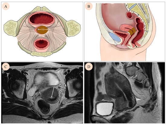Pre-treatment pelvic MRI was conducted using a high-field MR scanner (1.5 T or 3.0 T) with a contrast injection. The imaging protocol comprised T1-weighted (T1W), T2-weighted (T2W), and Diffusion-weighted (DW) images on various planes. For each patient, the plane revealing the maximum invasion distance was selected, and the TID was defined as the distance from the center of the cervical canal to the farthest edge (Figure 1A,B). Corresponding schematic representations of TID on MRI images are shown in Figure 1C,D, illustrating how the measurement was applied in clinical imaging. Two experienced gynecological radiologists (GA and GB) measured the TID based on fused images of transverse or oblique axial T2W sequences.
