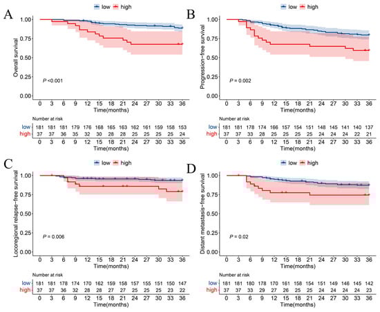 According to survival analysis, compared with the low group, the high-level TID group had worse OS as shown in Figure 2A (p < 0.001, Hazard Ratio [HR]: 3.419, 95% Confidence Interval [CI]: 1.671–6.998), worse PFS shown in Figure 2B (p = 0.002, HR: 2.488, 95% CI: 1.361–4.545), worse LRFS shown in Figure 2C (p = 0.006, HR: 3.5, 95% CI: 1.356–9.036), and worse DMFS shown in Figure 2D (p = 0.02, HR: 2.446, 95% CI: 1.126–5.315).
