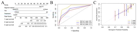 We established a prognostic model based on parameters including vaginal involvement, TID, and treatment (Figure 3A). The AUC for 1-, 2-, and 3-year OS were 0.91 (95% CI: 0.83–0.98), 0.79 (95% CI: 0.69–0.89), and 0.73 (95% CI: 0.63–0.83), respectively (Figure 3B). The calibration curves demonstrate the robust performance of the nomogram (Figure 3C). The C-index was 0.74.