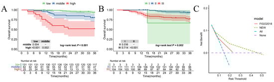 The Kaplan–Meier curves regarding the new risk stratification and 2018 FIGO stage are shown in Figure 4A,B. Within the new stratification, 131 patients in the low-risk group exhibited a 3-year OS of 93.7% (95% CI: 0.90–0.98), 62 patients in the middle-risk category showed an 80.2% 3-year OS (95% CI: 0.71–0.91), while 25 patients categorized as high risk had a 52.0% 3-year OS (95% CI: 0.36–0.76). Notably, patients with higher risk levels experienced a significantly worse prognosis (plow-risk vs. middle-risk: 0.004, pmiddle- vs. high-risk: 0.002, plow- vs. high-risk: <0.001, poverall: <0.001). In comparison, the 2018 FIGO stage system exhibited a 93.3% 3-year OS (95% CI: 0.89–0.98) of patients with stage II and 76.9% a 3-year OS (95% CI: 0.69–0.85) with stage III. Contrasting with the 2018 FIGO stage system, the new risk stratification demonstrated superior monotonicity, as evidenced by a higher χ2 value for the linear trend (28.03 vs. 9.35). Additionally, the new stratification exhibited better discriminatory ability for 3-year OS, reflected in a smaller Akaike information criterion (AIC) value (312 vs. 331) and a greater C statistic (0.74 vs. 0.65) (Table 3). As shown in Figure 4C, the decision curve analysis showed that if the threshold probability ranges from 8 to 45%, employing the new risk stratification nomogram for predicting a 3-year overall survival (OS) yields greater benefits compared to the 2018 FIGO stage system.