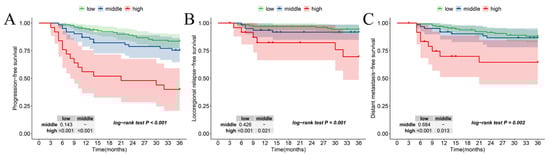 Kaplan–Meier according to the new risk stratification in (A) PFS, (B) LRFS, and (C) DMFS.