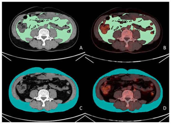 Measurement methodology for VAT and SAT SUVmean. A 56-year-old male patient with gastric cancer underwent preoperative 18F-FDG PET/CT examination. Visualized using LIFEx software (version 7.4.0). VAT (green color in (A)) and SAT (blue color in (C)) regions were delineated on three consecutive CT slices at the L4–L5 vertebral level based on the CT attenuation range (−50 to −150 Hounsfield units [HU]). The CT-defined VAT and SAT regions were subsequently co-registered with corresponding PET/CT fusion images (green color in (B), blue color in (D)), yielding a VAT SUVmean of 0.43 and an SAT SUVmean of 0.32.