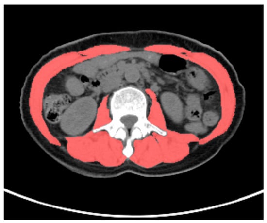 All PET/CT images were delineated by two nuclear medicine physicians, who were blinded to the clinical data. The VAT SUVmean, SAT SUVmean, and skeletal muscle cross-sectional area were obtained using the LIFEx software version 7.4.0. VAT and SAT regions at the L4–L5 vertebral level across three consecutive CT slices were delineated based on CT attenuation values, ranging from −50 Hounsfield units (HU) to −150 HU [13]. These CT-defined VAT and SAT regions were mapped onto the corresponding PET/CT fusion images to acquire the VAT SUVmean and SAT SUVmean, as shown in Figure 1. The total skeletal muscle cross-sectional area at the L3 level (including the psoas major, erector spinae, quadratus lumborum, transversus abdominis, internal oblique, external oblique, and rectus abdominis muscles) was delineated based on the CT attenuation range (−29 HU to 150 HU) on CT images, as shown in Figure 2. The skeletal muscle index (SMI) at L3 was calculated as follows: skeletal muscle cross-sectional area at L3 (cm2)/height squared (m2) [22].