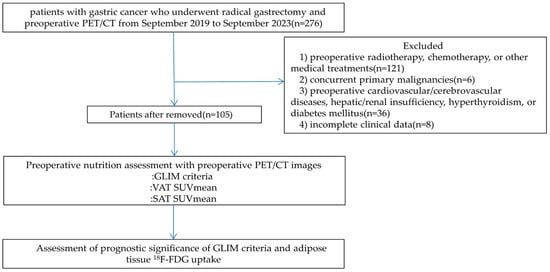 Adipose tissue can be classified into subcutaneous adipose tissue (SAT) and visceral adipose tissue (VAT) based on its anatomical location. Adipocytes contribute to tumor cell invasion and metastasis by secreting adipokines, maintaining an inflammatory state and facilitating angiogenesis [13,14]. 18F-fluorodeoxyglucose positron emission tomography/computed tomography (18F-FDG PET/CT), a noninvasive functional imaging technique, has been widely used in tumor diagnosis, staging, and treatment efficacy evaluation. The 18F-FDG uptake in adipose tissue reflects the glucose metabolism in adipocytes and inflammatory cells infiltrating the tissue; moreover, it can reflect the characteristics of the adipose microenvironment promoting tumor growth and aggressiveness [15,16]. Recent studies have increasingly demonstrated associations between 18F-FDG uptake in the adipose tissue and the clinical staging or prognosis of various malignancies. However, these results are contradictory. The majority of studies indicate that high 18F-FDG uptake in adipose tissue is a risk factor for patient prognosis [15,16,17,18]; however, a few studies have arrived at contrary findings [19]. Systematic investigations of gastric cancer remain scarce. Notably, emerging evidence suggests a strong correlation between preoperative adipose tissue 18F-FDG uptake and nutritional status in patients with gastric cancer [20]; however, the current GLIM nutritional assessment criteria do not incorporate adipose tissue-related parameters. Consequently, integrating adipose tissue 18F-FDG uptake with the GLIM-based nutritional evaluation is expected to enhance the predictive performance of the GLIM criteria and is of significant value for patient prognostic stratification and the formulation of individualized treatment plans.