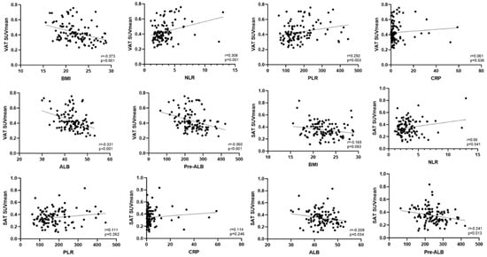 The correlation analysis of the VAT SUVmean and SAT SUVmean with clinical data demonstrated that VAT SUVmean showed statistically significant negative correlations with BMI, and albumin and prealbumin levels (p < 0.001). The VAT SUVmean exhibited statistically significant positive correlations with the NLR and PLR (p < 0.05). SAT SUVmean only displayed a statistically significant negative correlation with albumin and prealbumin levels (p < 0.05) (Table 2 and Figure 4).