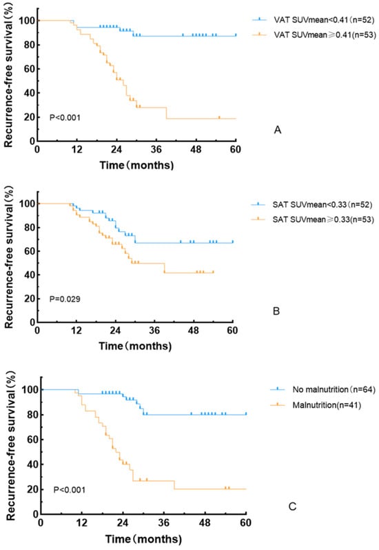 Recurrence-free survival curves based on VAT SUVmean (A), SAT SUVmean (B), and GLIM criteria (C).