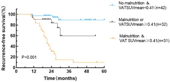 By integrating the GLIM criteria with VAT SUVmean, patient prognoses were further stratified into three distinct RFS subgroups exhibiting significant differences in outcomes: patients with concurrent malnutrition and a VAT SUVmean of ≥0.41, patients with either malnutrition or a VAT SUVmean of ≥0.41, and patients without malnutrition and a VAT SUVmean of <0.41 (Table 4 and Figure 6). Specifically, the malnutrition with VAT SUVmean ≥0.41 group (p < 0.001) and the malnutrition or VAT SUVmean ≥0.41 group (p < 0.001) demonstrated significantly lower RFS rates compared to the group without malnutrition and with a VAT SUVmean of <0.41.