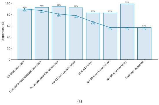 The individual frequency and cumulative frequency of TO parameters are depicted in Figure 2a. The most frequent reasons for failure to meet TO criteria were prolonged LOS, affecting 25 (17.4%) patients, and 30-day readmission, affecting 24 (16.7%) patients. Peri-operative morbidity was low, with eleven (7.6%) having a Clavien–Dindo grade III or greater complication and eight (5.6%) requiring ICU readmission. Ninety-day mortality was less than 1%.