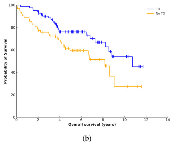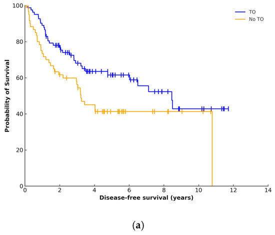 The median follow-up period was 4 years and 8 months. Disease recurrence occurred in 69 (48%) patients at a median of 19 months. Local failure occurred in 38 (55.1%) cases. Overall five-year DFS was 53% and was significantly higher for patients who achieved a TO (61.5% vs. 41.3%, p = 0.029) (Figure 3a). Five-year OS was 68.5% and was higher in patients who achieved a TO (59.35% vs. 76.04%, p = 0.022) (Figure 3b).