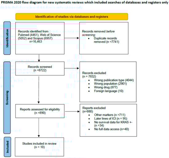 A comprehensive search yielded a total of 16,463 potentially eligible articles. Following the elimination of duplicate entries, 8722 titles and abstracts were screened. Within the phase of reading titles and abstracts, 7822 articles were excluded after careful examination due to incorrect publication type (n = 4044; systematic review, review, case reports, conference abstrackrasts), irrelevant population (n = 2901; animal, cells, other tumors), or wrong drugs (n = 877; not check point inhibitors). Among the 890 articles subjected to full-text review, 880 were further excluded due to other markers (n = 711), later lines of ICI (n = 95), absence of survival data KRAS +/− (n = 34), or unavailability of the full-text version (n = 40). Ultimately, 10 articles were deemed suitable for inclusion in the systematic review, 8 with OS data, 2 with PFS data, and 3 with both OS and PFS data. A detailed description of the study selection process is visually presented in Figure 1.