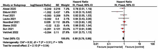 Outcomes were evaluated based on overall survival (OS) and progression-free survival (PFS), expressed as the logarithm of the hazard ratio (log HR) and corresponding standard error (SE). For studies that did not report HRs and 95% confidence intervals (CIs) directly [17,18], log HR and SE were derived by extracting survival data from Kaplan–Meier curves using Web Plot Digitizer v4.4 [19]. Hazard ratios were subsequently estimated using the method described by Tierney et al. [20]. When the number of patients at risk was not explicitly provided, we extracted this information when possible or estimated it based on the total number of patients included in the survival analysis and selected time points, with adjustments made to account for censored data. To derive the summary HR effect size, we pooled individual trial results using Review Manager, version 5.3, from the Cochrane Collaboration. Heterogeneity was assessed through the Cochran Q test and I2 statistic, with heterogeneity defined as I2 > 50% or a p-value < 0.10, following Higgins and Thompson [21]. A fixed-effect model was used for all analyses, given the consistently low heterogeneity across studies [21]. Study weights were calculated using the inverse variance method, adjusted according to the applied effect model, to determine each study’s contribution to the pooled hazard ratio (HR). Sensitivity analyses were conducted to assess the potential impact of extracting survival data from Kaplan–Meier curves. Forest plots were generated for each analysis, displaying individual HRs (boxes), 95% confidence intervals (horizontal lines), and study weights (reflected by box size); the pooled effect estimate was represented by a diamond. Publication bias was evaluated using a linear regression test for funnel plot asymmetry, with a p-value < 0.05 considered statistically significant. We used EZR software (https://www.jichi.ac.jp/usr/hema/EZR/statmedEN.html accessed on 14 June 2025) for meta-analysis.
