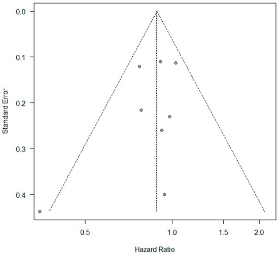 A meta-analysis was conducted to evaluate the association between KRAS mutations and overall survival (OS) in NSCLC patients receiving first-line immune checkpoint inhibitor (ICI) monotherapy. A total of eight studies had OS as an outcome. The presence of KRAS mutations was a significant prognostic factor for better OS in NSCLC patients treated with checkpoint inhibitors (HR = 0.89, 95% CI: 0.79–0.99) (Figure 2). There was a low degree of heterogeneity in the OS analysis (I2 = 16%) and no publication bias (p = 0.286). The sensitivity analysis, excluding two studies [17,18] that extracted survival rates from Kaplan–Meier curves, showed a non-significant HR (HR = 0.87, 95% CI: 0.76–1.0). The funnel plot for studies with overall survival is presented in Figure 3.