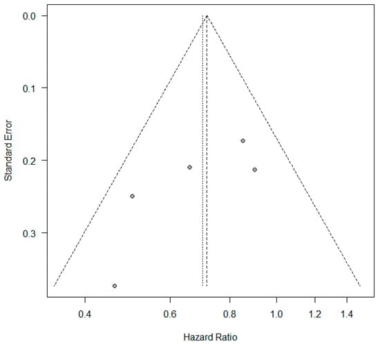 A meta-analysis was conducted to evaluate the association between KRAS mutation status and progression-free survival (PFS) in patients with non-small-cell lung cancer (NSCLC) receiving first-line immune checkpoint inhibitor monotherapy. A total of five studies had PFS as an outcome. The presence of KRAS mutations was a significant prognostic factor for better PFS in NSCLC patients treated with checkpoint inhibitors (HR = 0.72, 95% CI: 0.59–0.87) (Figure 4). There was a low degree of heterogeneity in the PFS analysis (I2 = 30%) and no publication bias (p = 0.124). The funnel plot for studies with progression-free survival is presented in Figure 5.