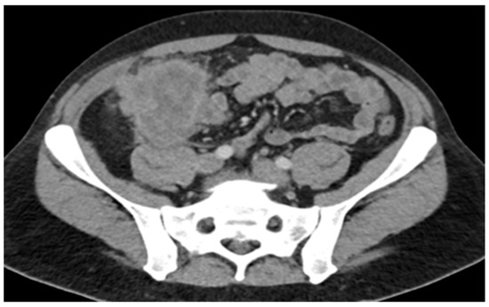 A 45-year-old male with a past medical history of lactose intolerance presented to his primary care physician with a five-week history of right lower-quadrant abdominal pain, bloating, swelling, discomfort, and increased flatulence. On physical examination, a visible and palpable mass was noted in the right lower quadrant. A contrast-enhanced computed tomography (CT) scan of the abdomen and pelvis revealed an 8 cm mass arising from the cecum, accompanied by presumed metastatic mesenteric lymphadenopathy and potential early invasion of the right lower-quadrant anterior abdominal wall musculature (Figure 1).