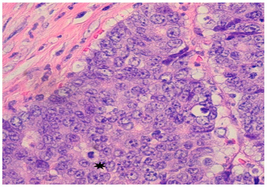 Subsequent colonoscopy identified a large cecal mass. Histopathological analysis of biopsy samples revealed a moderately to poorly differentiated adenocarcinoma. Microscopy demonstrated malignant cells with irregular, hyperchromatic nuclei, prominent nucleoli, and frequent mitotic figures (Figure 2). Immunohistochemistry confirmed intact nuclear expression of all mismatch repair (MMR) proteins, indicating microsatellite-stable (MSS) status. Immunohistochemical staining for mismatch repair (MMR) proteins showed intact nuclear staining, indicating microsatellite-stable (MSS) status. PD-L1 immunohistochemistry (22C3 pharmDx assay) was also performed on the primary tumor and revealed a tumor proportion score (TPS) of <1%, with minimal immune-cell staining. Despite low PD-L1 expression, the decision to proceed with immunotherapy was supported by the presence of an ultra-mutated POLE mutation and a high TMB, both recognized as predictive biomarkers for immune checkpoint inhibitor response.