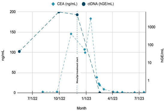 Trends of CEA and ctDNA throughout patient’s clinical course. Green region: rising ctDNA levels prior to treatment initiation. Blue region: rapid decline in ctDNA from Month 8 to Month 10, following initiation of Nivolumab + Ipilimumab. CEA lag: decline in CEA noted after ctDNA drop, suggesting delayed response by conventional marker. Timeline annotations: key therapeutic events, such as treatment initiation (Month 8) and any subsequent modifications or responses, are clearly marked to aid interpretation.