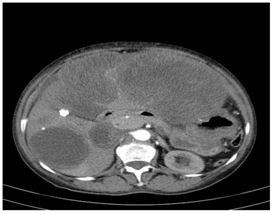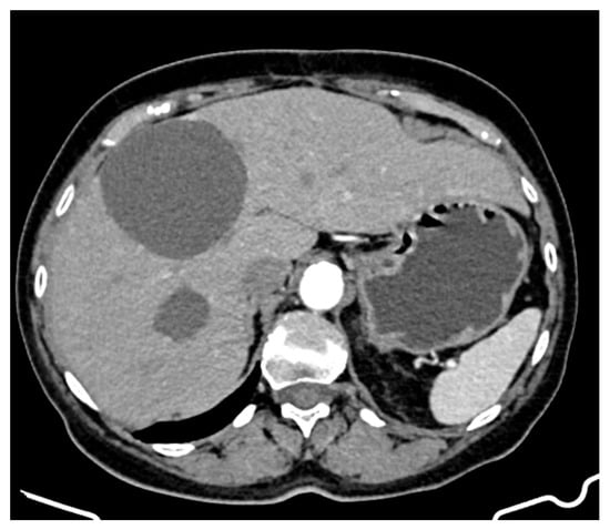 An abdominopelvic CT revealed liver enlargement due to the presence of numerous cystic lesions ranging in size from 1 cm to 18 cm, most of them located in the right hepatic lobe (Figure 1). Two of the largest cystic formations were located at the inferior liver margin, one in segment IVb and the other in segment III of the left hepatic lobe, occupying almost the entire abdominal cavity. The inferior pole of the cystic formation arising from the left hepatic lobe extended into the pelvic cavity (14 × 18 × 18.5 mm AP/Transverse/CC), displacing the transverse colon posteriorly and shifting the jejuno-ileal loops toward the right iliac fossa. The cysts had well-defined contours, but their inner walls varied in thickness and exhibited heterogeneous contrast enhancement. Three hepatic parenchymal calcifications were present in the right hepatic lobe (segments V and VI), with the largest measuring 14 mm and the smallest 2–3 mm; two of them were adjacent to the cystic wall. A thin layer of perihepatic/hepatodiaphragmatic fluid was also noted, with an uneven thickness ranging from 1 to 2.3 cm.