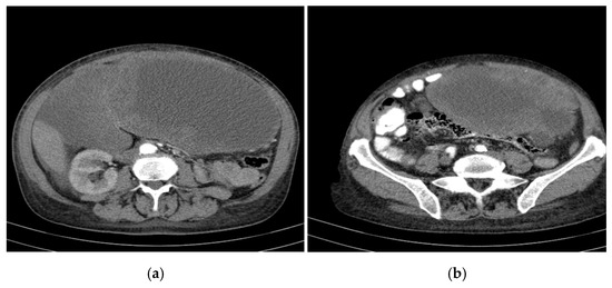 CT appearance at the time of diagnosis: the inferior pole of the cystic formation in the left hepatic lobe extended into the pelvis (14/18/18.5 cm), displacing the transverse colon and small intestine posteriorly toward the right iliac fossa. (a) upper abdomen section on the left (b) pelvic section on the right.