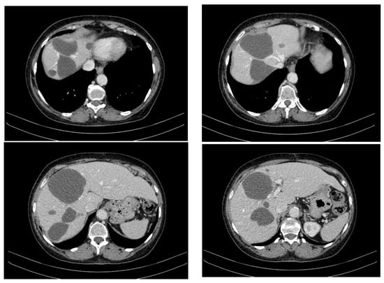 - Imaging: Abdominopelvic CT showed numerous cystic liver lesions (1 cm to 18 cm), mostly in the right hepatic lobe. Largest cysts in segments IVb and III of the left hepatic lobe.